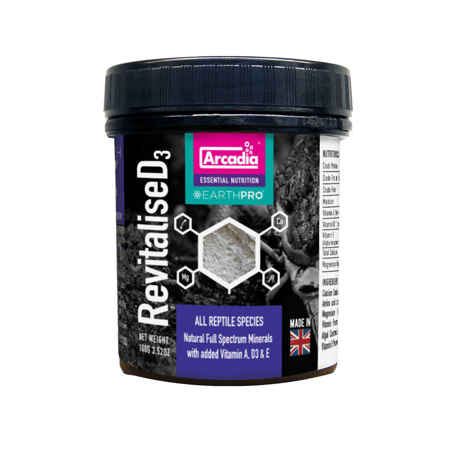 EarthPro-RevitaliseD3 is the result of years of research and development. By working with Vets and Reptile care experts around the world we have developed a brand new ultra-fine powder that can be used to help top up levels of preformed vitamins A, D3 and E whilst still supplying the very best of the balance of natural Earth Minerals, Amino Acids, Full-Spectrum carotenoids and Bee Pollen.