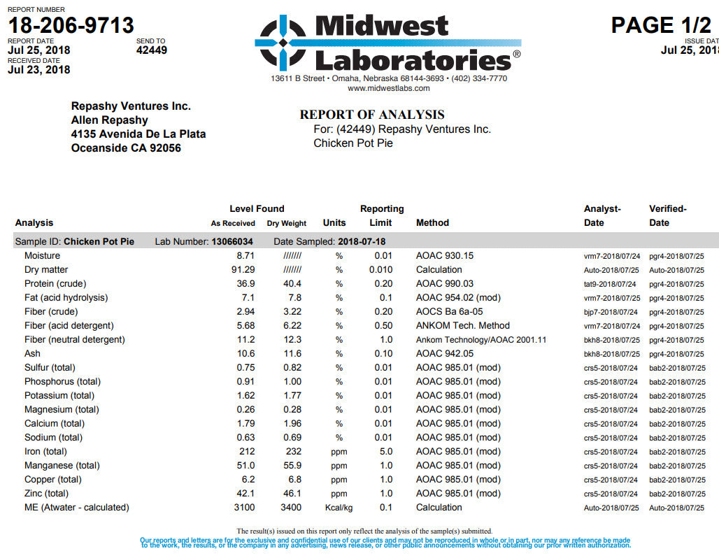 INGREDIENTS: Chicken Broth, Pea Flour, Corn Flour, Carrot Powder, Potato Flour, Heat Stabilized Rice Bran, Alfalfa meal, Dried Egg, Dandelion Flour, Black Soldier Fly Larvae Meal, Dried Seaweed Meal, Lecithin, Locust Bean Gum, Calcium Carbonate, Citric Acid, L-Methionine, Taurine, Dried Kelp, Salt, Calcium Propionate and Potassium Sorbate (as preservatives), Magnesium Amino Acid Chelate, Zinc Methionine Hydroxy Analogue Chelate, Manganese Methionine Hydroxy Analogue Chelate, Copper Methionine Hydroxy Analogue Chelate. Vitamins: (Vitamin A Supplement, Vitamin D3 Supplement, Choline Chloride, L-Ascorbyl-Polyphosphate, Vitamin E Supplement, Niacin, Beta Carotene, d-Calcium Pantothenate, Riboflavin, Pyridoxine Hydrochloride, Thiamine Mononitrate, Folic Acid, Biotin, Vitamin B-12 Supplement, Menadione Sodium Bisulfite Complex).