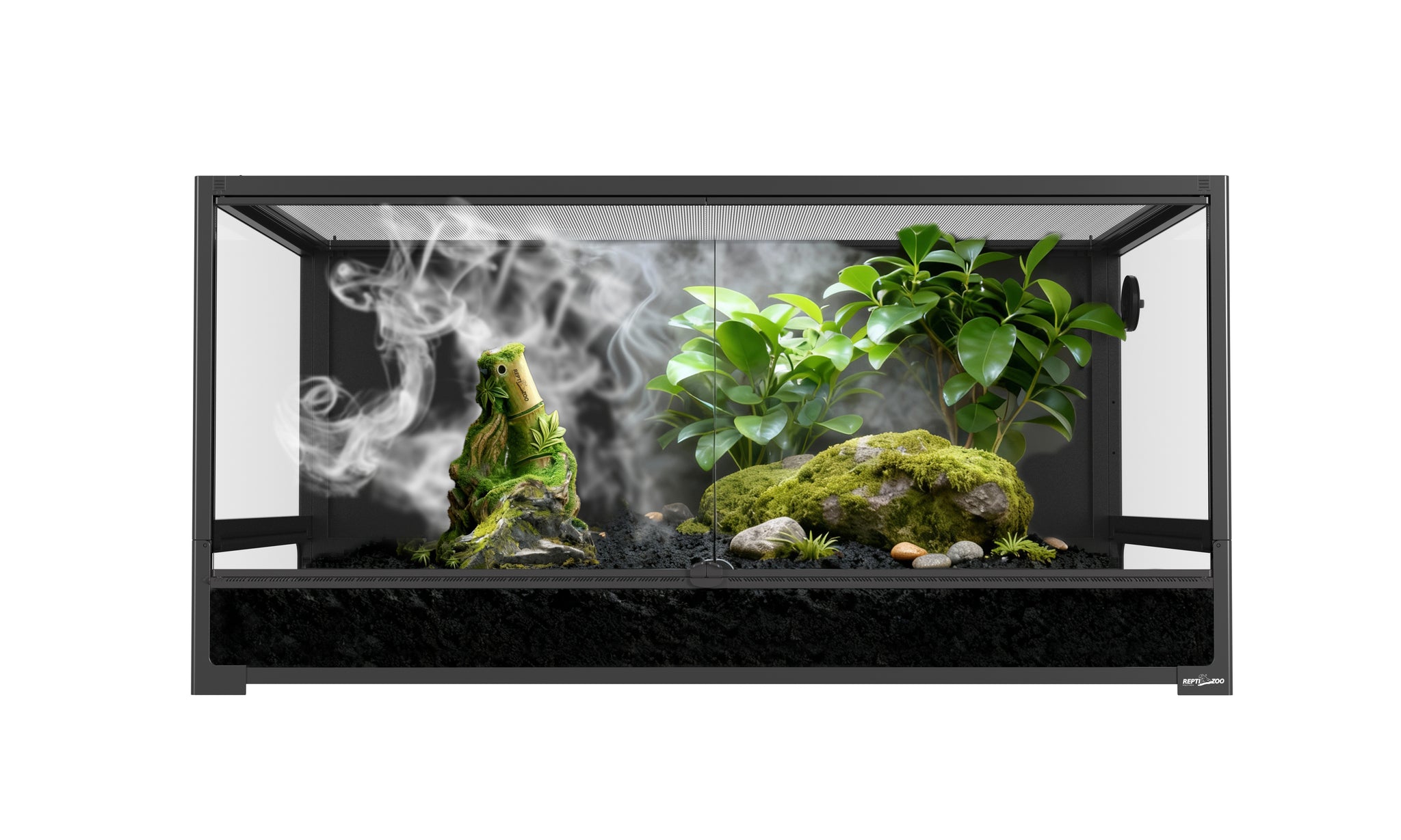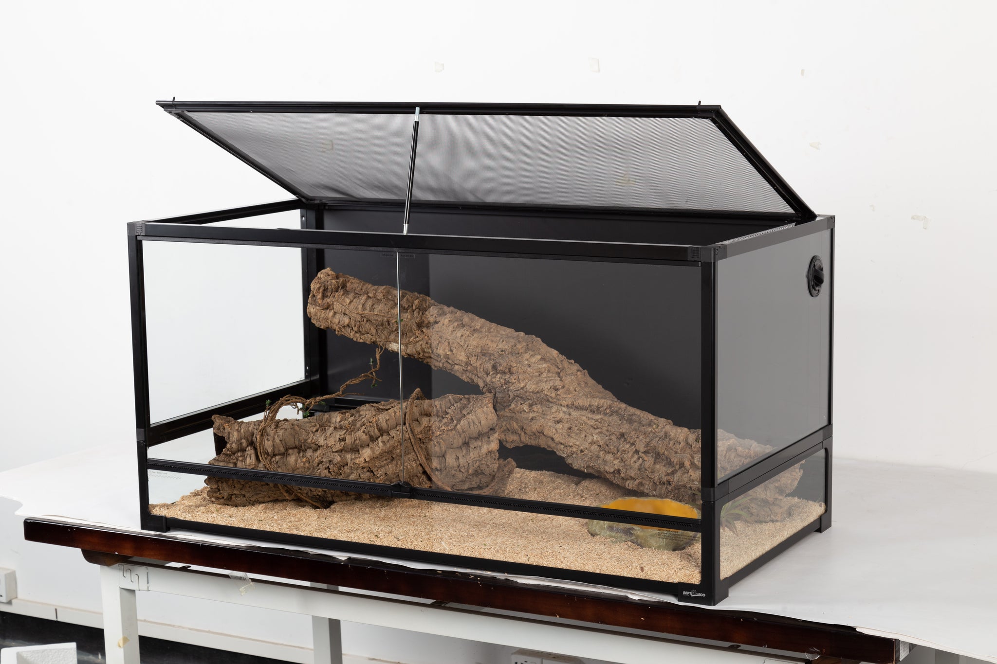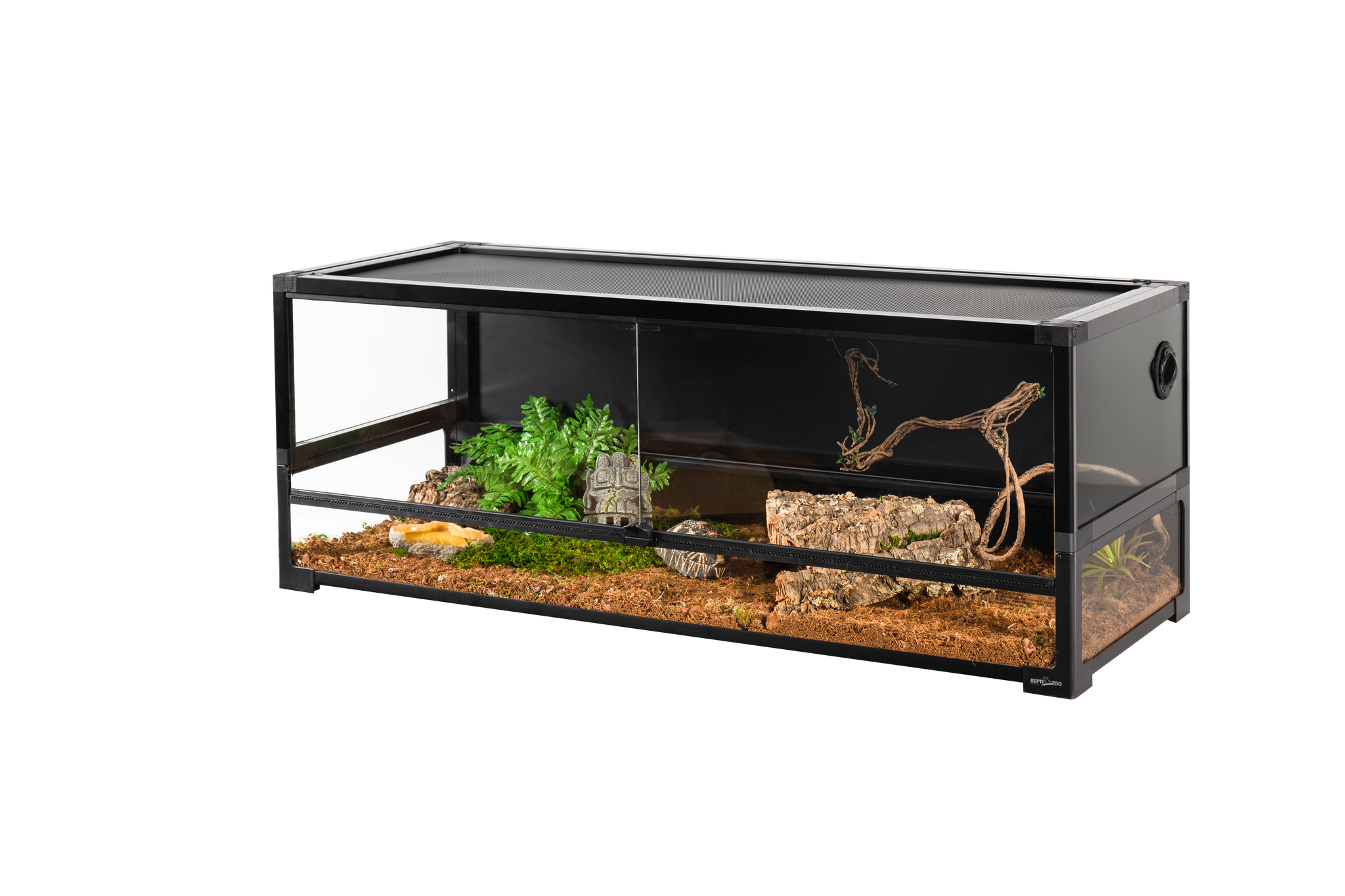 Central to its design is a comprehensive ventilation system. The removeable mesh top cover provides plenty of ventilation for proper air-flow throughout the enclosure and allows full spectrum, UVB, and IR light penetration. Complementing this, front ventilation strips are strategically placed to further promote air-flow and minimize humidity build-up in the habitat, ensuring a healthy, non-stagnant environment.