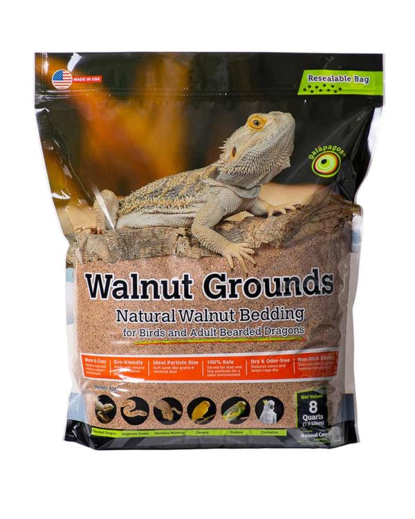 Galápagos Walnut Bedding is 100% Natural English walnut that is ideal for birds and adult bearded dragons. Crushed walnut substrate helps maintain a dry, odor free environment and is incredibly absorbent. It does not cling or stick to surfaces making cleaning a simply and fast. Use with birds that have grates separating the litter from birds to avoid potential ingestion.