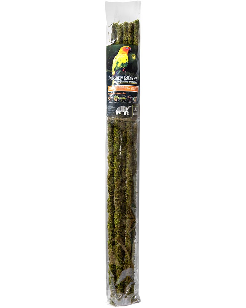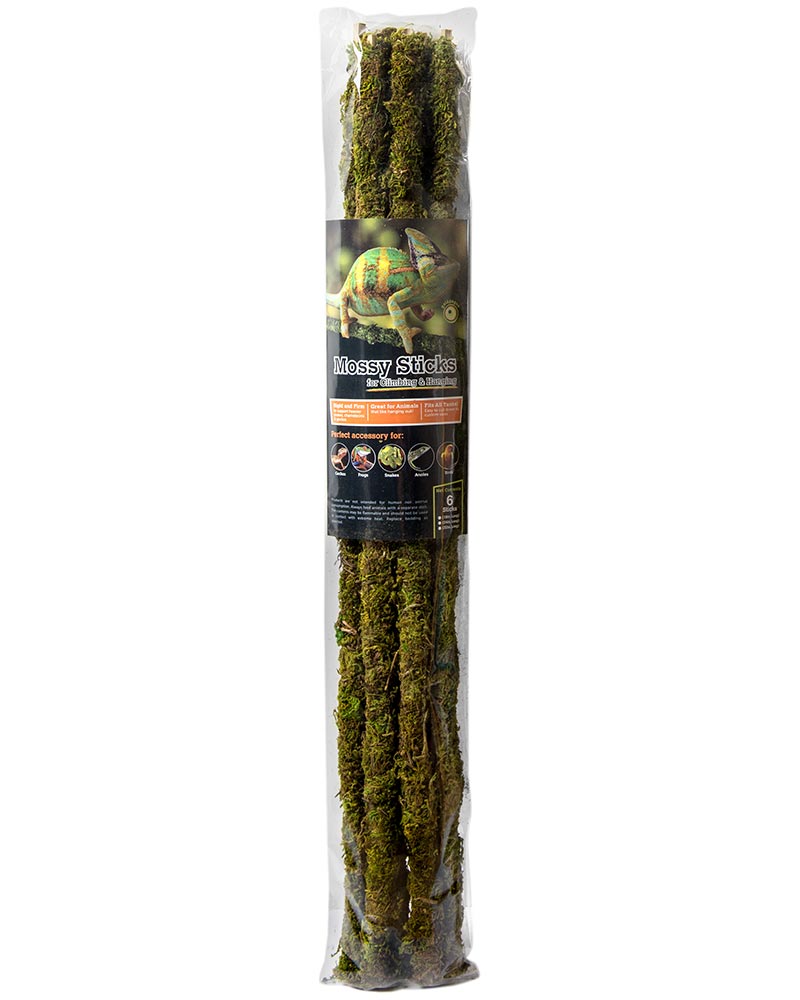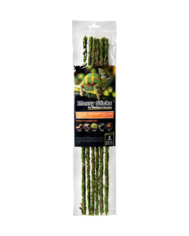 Galapagos Mossy sticks are made with real preserved moss and a solid wood core. They are bendable to accommodate various terrarium sizes yet firm enough to support Chameleons, Geckos, Tree Frogs, and Climbing Reptiles. They are perfect for hanging out! Use them in bird cages as perches for all birds. Each package comes with 6 stakes, so have fun and be creative!