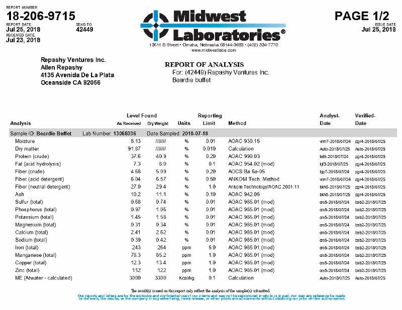 Thanks to their work, this custom blend has become so popular to dragon keepers that we have decided to go ahead and create a factory version to make it easier for keepers to use. The new Repashy Beardie Buffet is a blend of Grub Pie and Veggie Burger as prescribed by Fairytail Dragons, with the addition of a touch of Carrot and Moringa Leaf because these are some exciting new ingredients Repashy has brought in since the original formulation of Veggie Burger. Veggie Burger has also just been revised to include these ingredients as well.