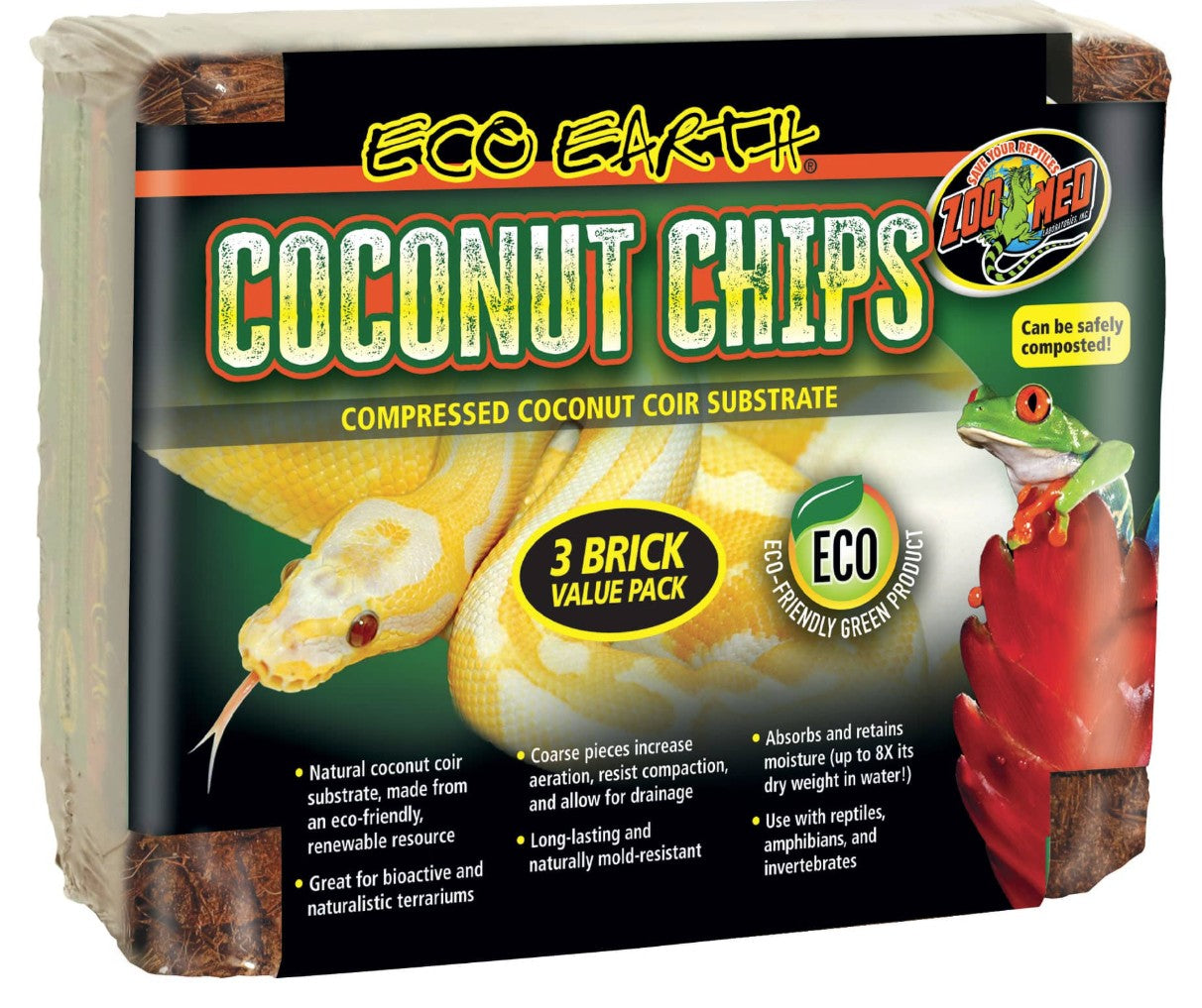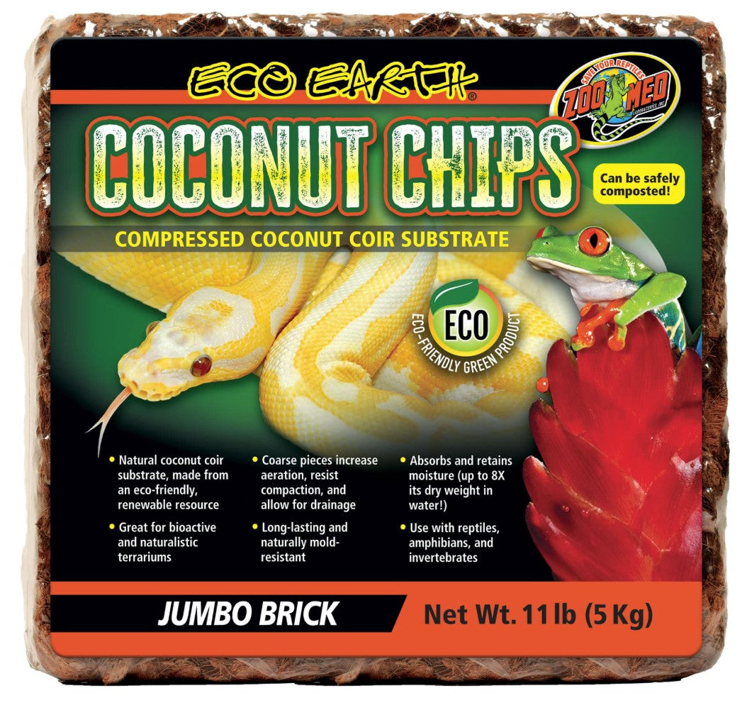 Zoo Med’s new Eco Earth Coconut Chips is a natural coconut coir substrate made from an eco-friendly, renewable resource. The material is highly absorbent (holds up to 8 times it’s dry weight in water!) and retains that moisture well, releasing it slowly to create a humid, tropical environment perfect for a variety of different reptiles, amphibians, and invertebrates.